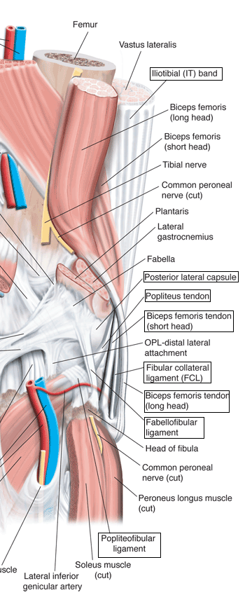 The lateral side of the knee, including the posterolateral corner, is stabilized by a number of static and dynamic structures that prevent pathological translation, rotation, and angular motion. Seebacher et al2 used the layer concept to divide the lateral structures into three distinct layers from superficial to deep.